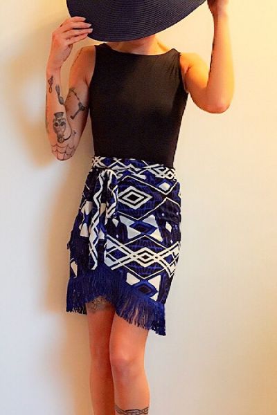 Saia Pareô Curta Tribal Azul Franja Azul
